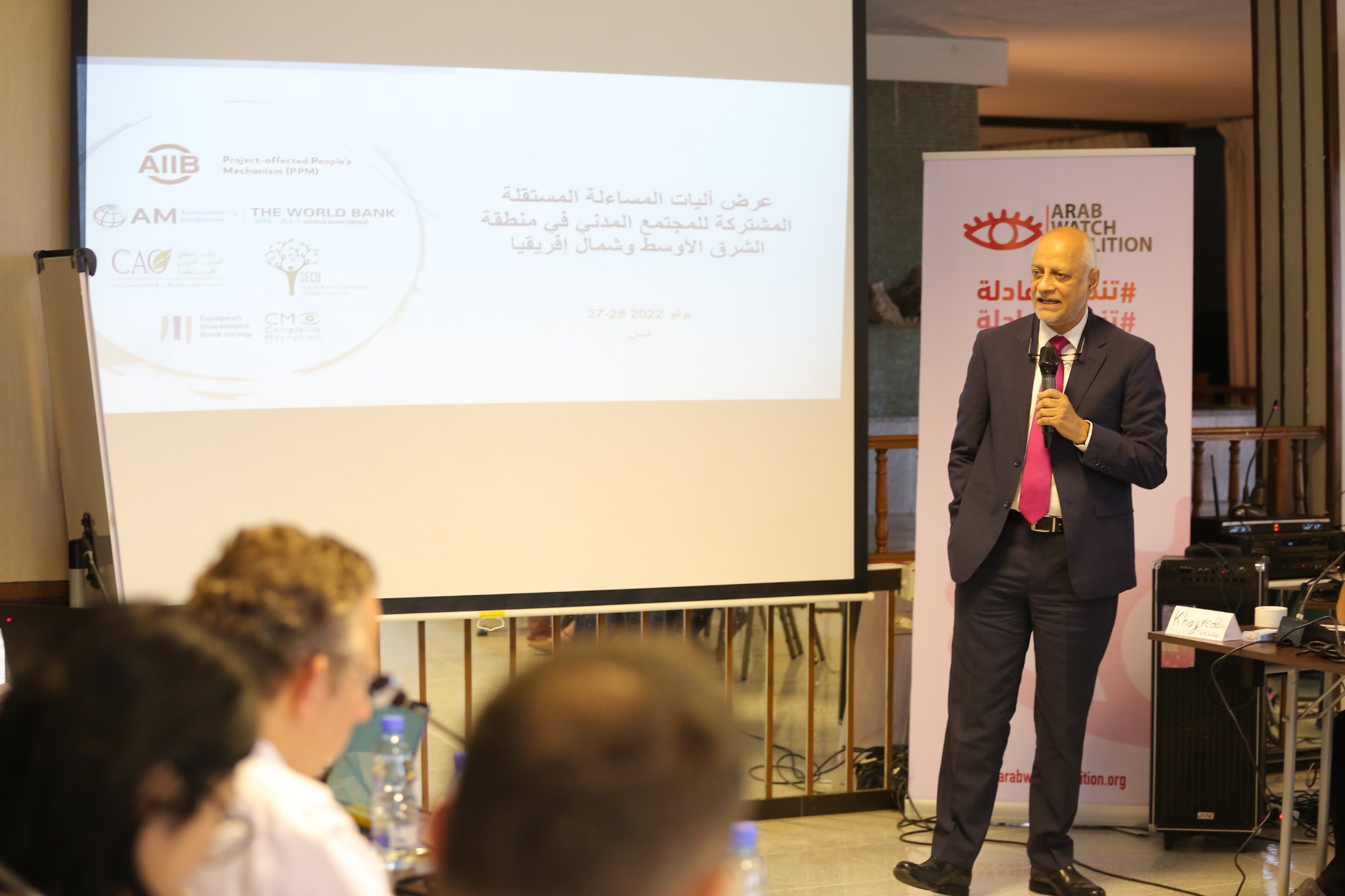 جمعت ورشة العمل ممثلين عن مكتب المحقق ومستشار الامتثال بالأنظمة (CAO) الخاصة بمؤسسة التمويل الدولية، ولجنة التفتيش (IP) الخاصة بالبنك الدولي، آلية الأشخاص المتضررين من المشروع (PPM) الخاصة بالبنك الأسيوي للإستثمار في البنية التحيتة، وآلية الشكاوى (CM) الخاصة ببنك الإستثمار الأوروبي، ووحدة الامتثال الاجتماعي والبيئي (SECU) الخاصة ببرنامج الأمم المتحدة للتنمية. حضر الورشة أكثر من 40 منظمة من منظمات المجتمع المدني من منطقة الشرق الأوسط وشمال إفريقيا، بما في ذلك أعضاء التحالف والشريك الدولي اكوانتابيلتي كونسيل Accountability Counsel.