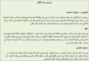 4. تبني مفهوم Water-Energy-Food Nexus في التخطيط الزراعي، بحيث يُنظر إلى المياه والطاقة والغذاء كقطاعات متكاملة.